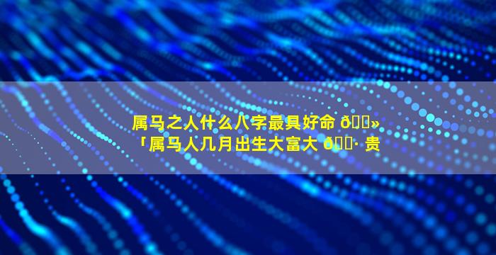 1、属马之人什么八字最具好命最有利于属马人生辰八字:天干地支: 甲午年、丙午年、戊午年、庚午年 巳月、未月、酉月 寅日、午日、辰日五行属性: 木旺,有贵人相助 火旺,事业有成 土旺,财运亨通 金旺,才华出众 水旺,感情顺利其他因素: 日柱强旺,拥有领导力 食伤生财...