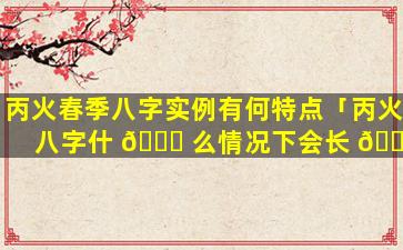 1、丙火春季八字实例有何特点丙火春季八字实例特点一、阳气旺盛春天为阳气生发的季节,丙火为阳性之火,春季丙火八字阳气旺盛。二、木旺而火弱春天五行属木,木旺而火弱。木主生火,因此春季丙火容易被木消耗,导致火势减弱。三、日主旺而印星弱丙火为阳,生于春季木旺之地...